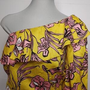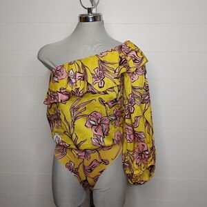 Gorgeous yellow floral one-shoulder bodysuit with ruffle detail and puff sleeve. Snap closures. Pull on style. In excellent condition. Blogger fave.