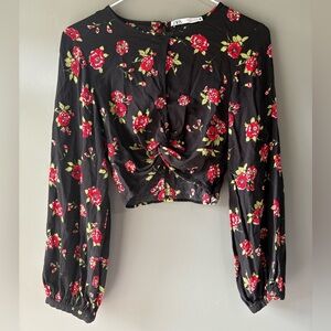 ZARA size small Floral Black Crop Top, long sleeve, key hole front