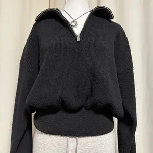 Stay cozy and stylish with this black half zip sweater. Perfect for any occasion, this sweater offers both comfort and elegance.