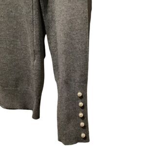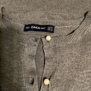 Zara cardigan with pearl buttons down front and 5 pearls on each cuff as shown. Colour is gray. Size small. No fabric tag but is super soft and has some stretch.