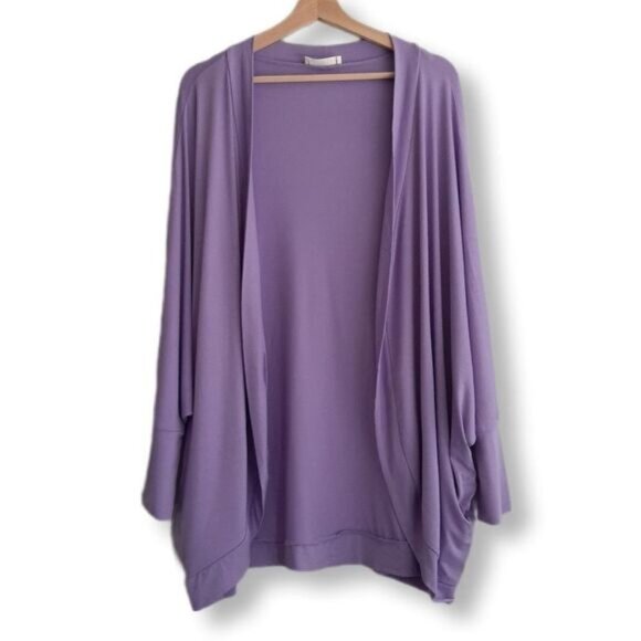 • Relaxed fit long sleeve open front soft cardigan in lilac /lavander with dolman sleeves and side pockets.