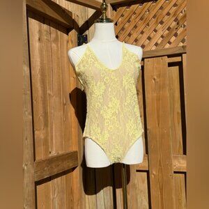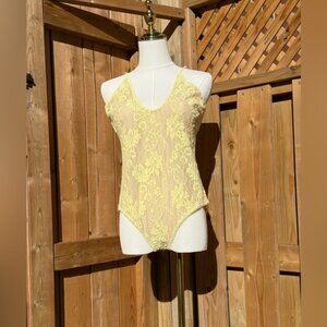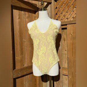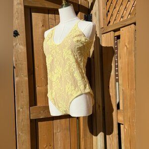 Lemon yellow stretch-design corded lace scoop neck bodysuit from Zimmermann. With adjustable spaghetti straps, scoop back, full lining. Slip-on style.