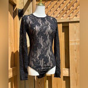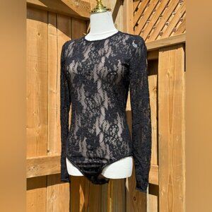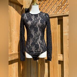 A lace bodysuit featuring a scoop neck and back.
