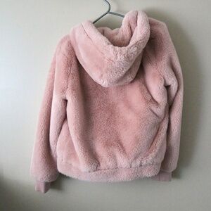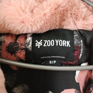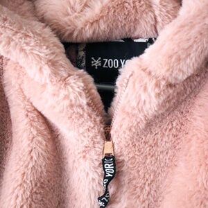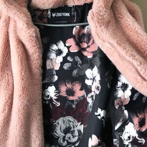 Fabulous Zoo York faux fur pink hooded sweater/jacket. Blush pink fuzzy fun fur with a full zipper closure featuring a rose gold tone zipper pull. Lined with for added warmth with a lovely floral material. Two pockets at front of jacket with ribbed cuffs to keep the cold out. Approx. measurements: chest = 19", body length = 21", arm length (pit to cuff) = 18.5". Pre-owned but lightly used and in great condition. NOTE: there is a small tear inside of jacket lining but not noticeable from outside and easy to fix if you sew! Smoke-free, pet friendly home!
