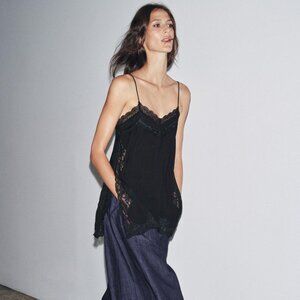 V-neck top with spaghetti straps. Matching lace appliqué detail. Hem with side vents. Color is Black. Size M. Beautiful longer camisole/top. NEW!