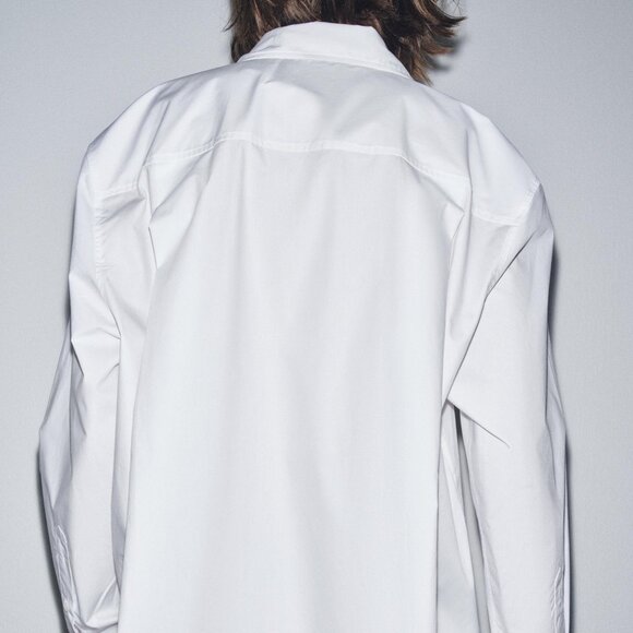 Shirt made of cotton yarn. Lapel collar and long sleeves with cuffs. Asymmetric hem. Front closure with buttons hidden by a placket.