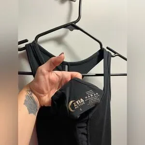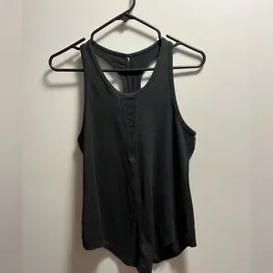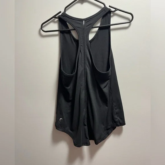 Sleek black racerback tank. Ideal for workouts or casual outings. Lightweight and breathable.