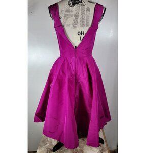 Make a show-stopping entrance in this exquisite Zac Posen fit and flare cocktail dress, crafted from luxurious 100% silk in a stunning vibrant fuchsia (magenta) hue. This iconic dress features a beautifully structured bodice with a flattering V-neckline and defined bust cups, leading to a dramatically flared skirt that holds its shape, creating a timeless and elegant silhouette.