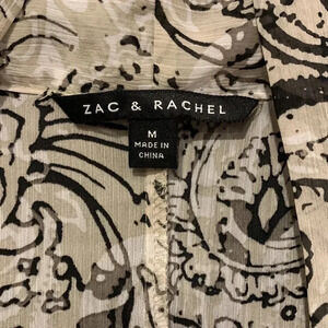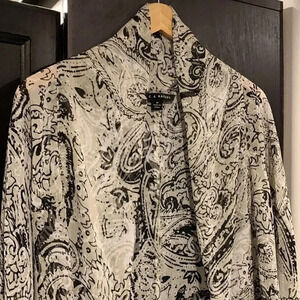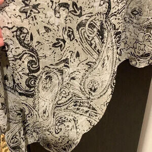 Gorgeous light taupe, white and black paisely patterned duster, size M. 3/4 sleeves. Rounded bottom hem and loose and flowy.