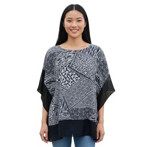 Elevate your wardrobe with this stunning Zac & Rachel Woman Poncho Top. The black and white geometric pattern adds a touch of artsy elegance to any outfit. The kimono sleeves and relaxed fit make it perfect for any occasion, from casual to business, and everything in between. Crafted from lightweight and wrinkle-resistant polyester, this semi-sheer blouse is perfect for all seasons. The pullover closure and 3/4 sleeves add to the effortless style of this top. The plus size 3X fits true to size, making it an excellent choice for any bohemian or hippie-inspired look.