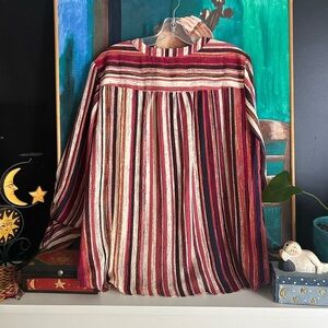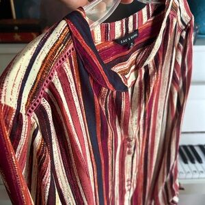 Stylish blouse with red and cream stripes. Features a classic collar and button-up front.