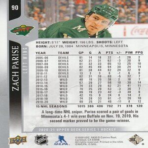 Zach Parise (Wild) 2020/2021 Upper Deck Series 1 Hockey Card - Card Number 90