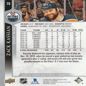Zack Kassian (Oilers) 2020/2021 Upper Deck Series 1 Hockey Card - Card Number 70