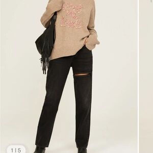 Crafted from soft 100% wool, this brown knit features playful multicolor embroidered “Give Me Love” text on the front, ribbed cuffs and hem, side slits for easy movement, and a relaxed, draped silhouette.