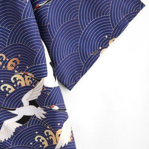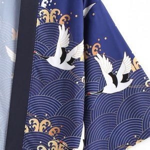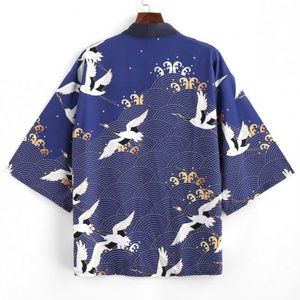 Add a splash of oriental elements to your simple wardrobe with this kimono shirt. The oriental piece print with vibrant sea waves and flying crane motif pattern is a good way to spice up the vacation vibes of your outfits.
