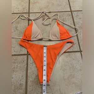 Zaful, bikini, swimsuit, swimwear, ribbed, color-block, orange, tan, high-cut, cheeky, triangle top, size small, new, beach, pool, vacation.