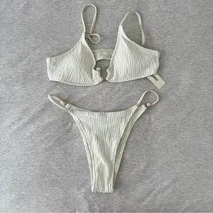 This chic Zaful bikini set features a ribbed texture in a crisp white hue, offering a modern and minimalist look. The triangle top comes with adjustable straps for a personalized fit, while the high-cut thong bottom enhances the silhouette with its sleek design. Perfect for a stylish day at the beach or pool.