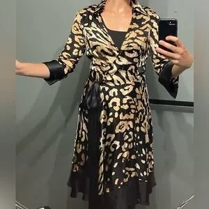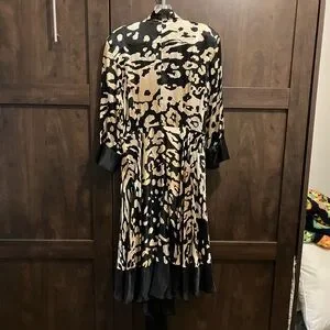 Elevate your evening look with this sophisticated Zara Woman silk robe, wrap design and a flattering V-neckline. Made in Spain. Size medium, however there is plenty of fabric and could fit larger sizes. Generous length, I am 5’10” for reference. There are some damaged spots as seen in the last 3 photos, from stretching at the seams. Could be repaired. Smoke free home.