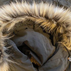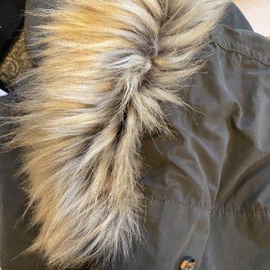 This jacket has a removable faux fur hood and multiple pockets, buttons, and strings allowing for it to be worn in multiple different ways.