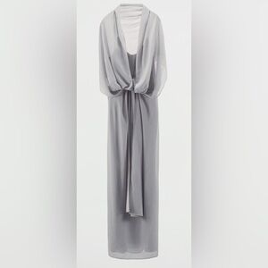 This stunning gown by Zara features an elegant asymmetrical design with ruched detailing, perfect for a wedding guest or cocktail event. The one-shoulder neckline and 3/4 sleeves add a touch of sophistication, while the flowing maxi length in a chic gray or silver hue ensures a graceful silhouette.