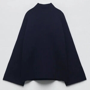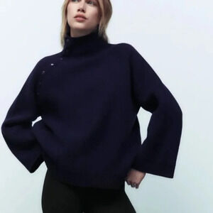 Zara 96% Merino Wool High Buttoned Collar Knit Sweater Navy Blue Size Medium