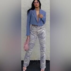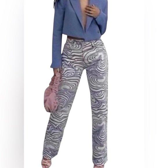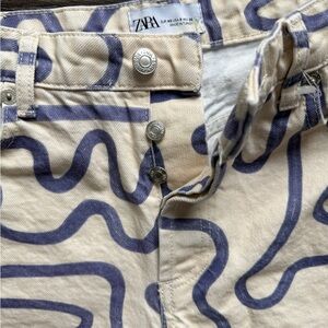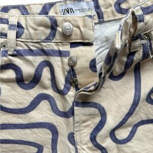 Zara high-waisted five pocket funky jeans. Front metal button closure. Funky wavy abstract doodle print. 100% cotton Color: ecru / navy