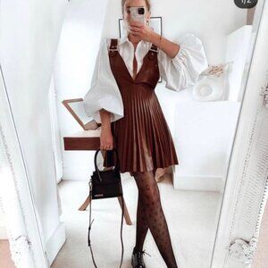 Zara Accordion Pleated Faux Leather Mini Dress Brown Size XS Blogger Fav