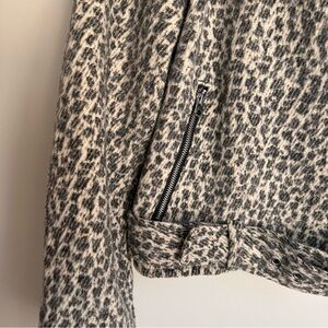Zara moto-inspired jacket in a neutral black and beige leopard print. It features an asymmetrical zip front, zip pockets, and a belted waist for a flattering, structured fit. Fully lined for comfort. A standout piece that adds edge to any outfit while staying warm and stylish.