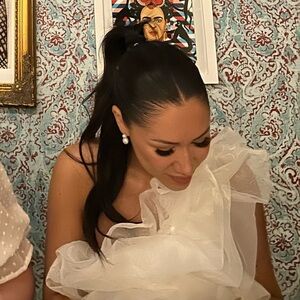 Chic white organza one-shoulder top with ruffled design. Beautiful top for a bridal event.