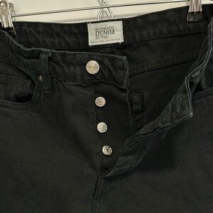 ⭐️Like new⭐️ Zara Authentic Denim By TRF- Size 4. Button fly. Stylish black denim jeans. Versatile & trendy. The care/material tag has been cut out of these previously owned black jeans & I am unable to confirm what they are made out of, otherwise, these are in like new, excellent condition. Very slight fading that is noticeable only when looking close up in a few areas. The buttons on the fly are absolutely stunning on these jeans! (Photos #6-7) Features fraying on leg hems. View last two posted photos for visual of inseam & outseam laying flat measurements.