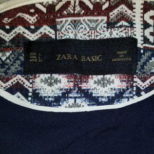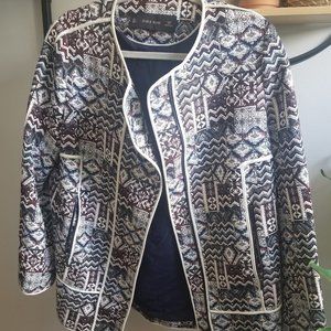 Great Condition! Lightweight round collar jacket with Aztec pattern, round collar and piped seams. Navy / grey / burgundy. Zip and press-stud closure.