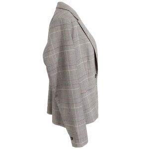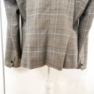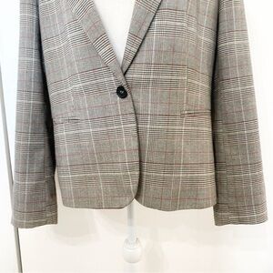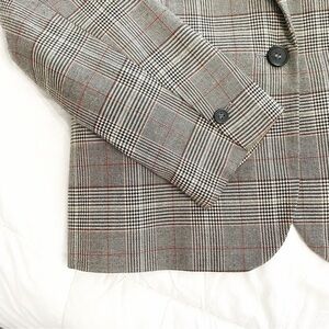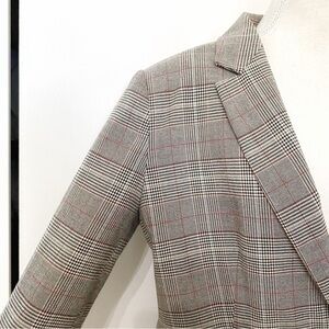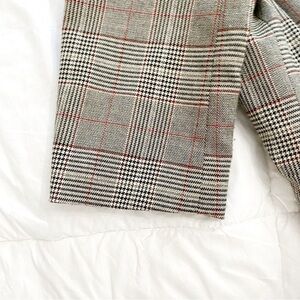 ZARA BLACK WHITE RED PLAID NOTCHED LAPEL SINGLE BUTTON BLAZER JACKET, a black white and red plaid pattern allover notched lapel colar single button closure long sleeve blazer jacket - formal with a red touch for a little bit of colour on this neutral achromatic blazer - button at cuffs- lined -regulard shoulder pads - welt pockets detail on the front (not usable) - tailored at waist for a feminine fitted touch - not stretch - plaid pattern is a mix of checkered plaid and houndstooth pattern which is subtil but interesting design - perfect business blazer for work at the office with trousers pants, pencil skirt or sheath dress, pumps or heels for a feminine look of loafers for a hipster outfit.