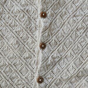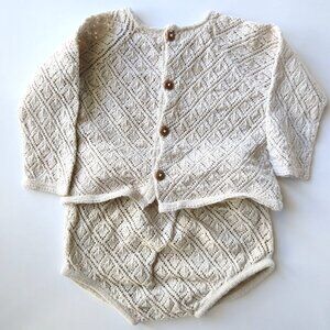 The set includes a long-sleeve cardigan sweater and a pair of matching bloomer shorts. Both pieces feature an all-over crochet or diamond open-knit pattern. The colour is a neutral cream / off-white.