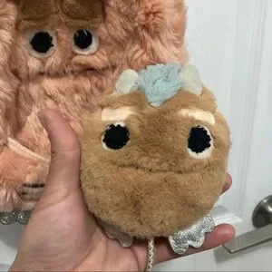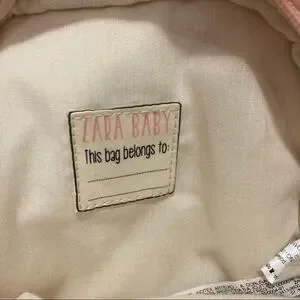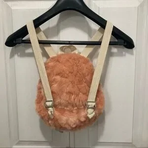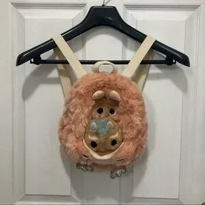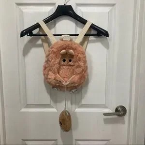 Fuzzy pink monster backpack by Zara Baby - baby monster plush attached with string can be placed inside of front pouch - adjustable canvas straps - name patch inside - like new condition