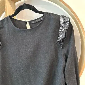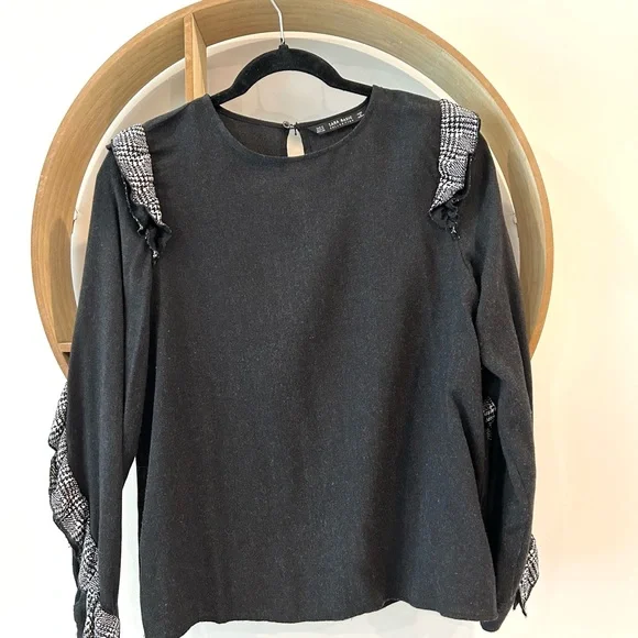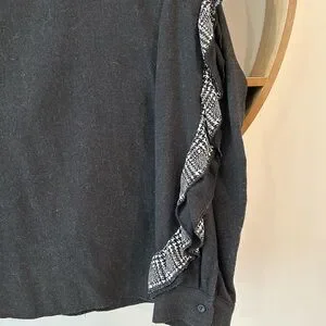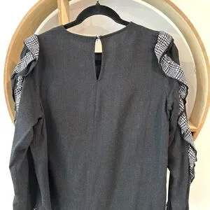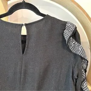 Elegant charcoal top with stylish white houndstooth check ruffled accents. Perfect for any occasion.