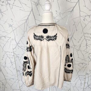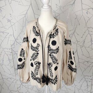 Zara Beige Floral Embroidered Cotton Linen Tassel Lantern Sleeve Jacket
