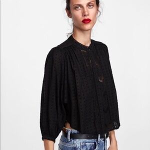 - Zara black blouse Swiss dot material with pretty embroidered detail across the back and down the