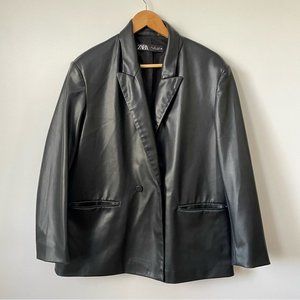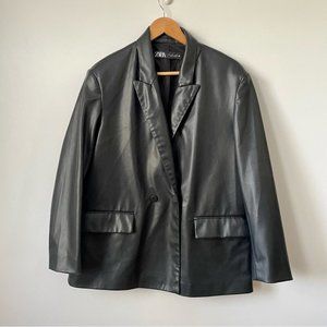 Zara Black Faux Leather Oversized Double Breasted Blazer, Sz L