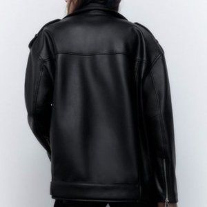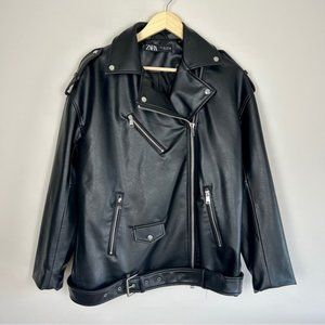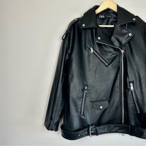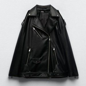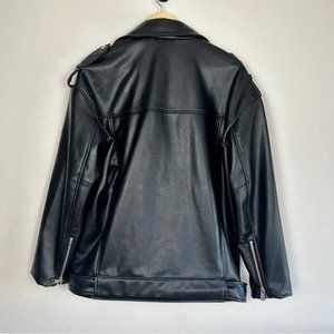 Sleek black leather jacket. Features asymmetrical zipper. Multiple pockets. Belted waist. Classic biker style.
