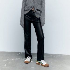 STRAIGHT LEG MID RISE FAUX LEATHER LONG LENGTH PANTS