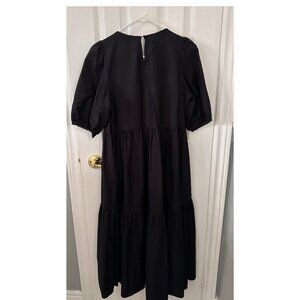 Elegant black midi dress. Puff sleeves. Tiered skirt design. Perfect for any occasion.