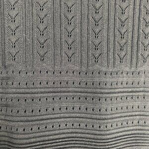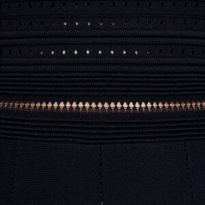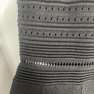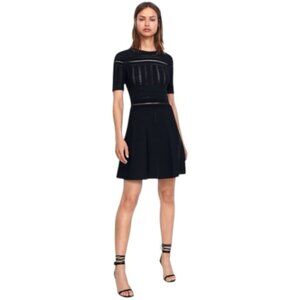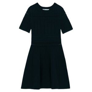 Featuring a fitted bodice with intricate open knit detailing and a flattering A-line skirt, this dress offers the perfect balance of edgy sophistication and feminine charm. The short sleeves and breathable knit make it ideal for transitioning between seasons, while the versatile black hue ensures it's a staple for everything from office days to evening outings. Style it with strappy heels for a sleek, polished look.