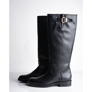 Sleek black over the knee boots. Stylish buckle detail. Perfect for any occasion.