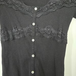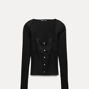Zara Lace Combined Top (style number 0085/870/800). It is a black, long-sleeve, ribbed knit top featuring a round neckline, tonal lace appliqué on the bodice, and a button-front closure.