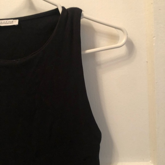This chic black mini dress from Zara features a ribbed texture and a stylish neckline, perfect for a night out. Its sheath silhouette offers a flattering fit, making it an ideal choice for cocktail occasions. The sleeveless design adds a touch of elegance to this versatile piece. Used slightly, please check pics. Size small.