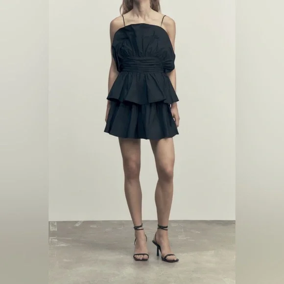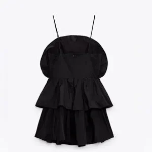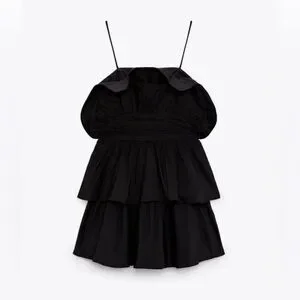Stylish black mini dress with layered design. Ideal for evenings out.