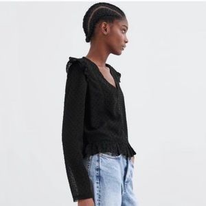 Features: Lightweight blouse with a subtle polka dot pattern, ruffle detail and button down top.