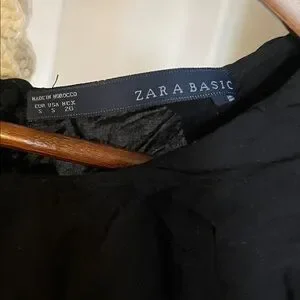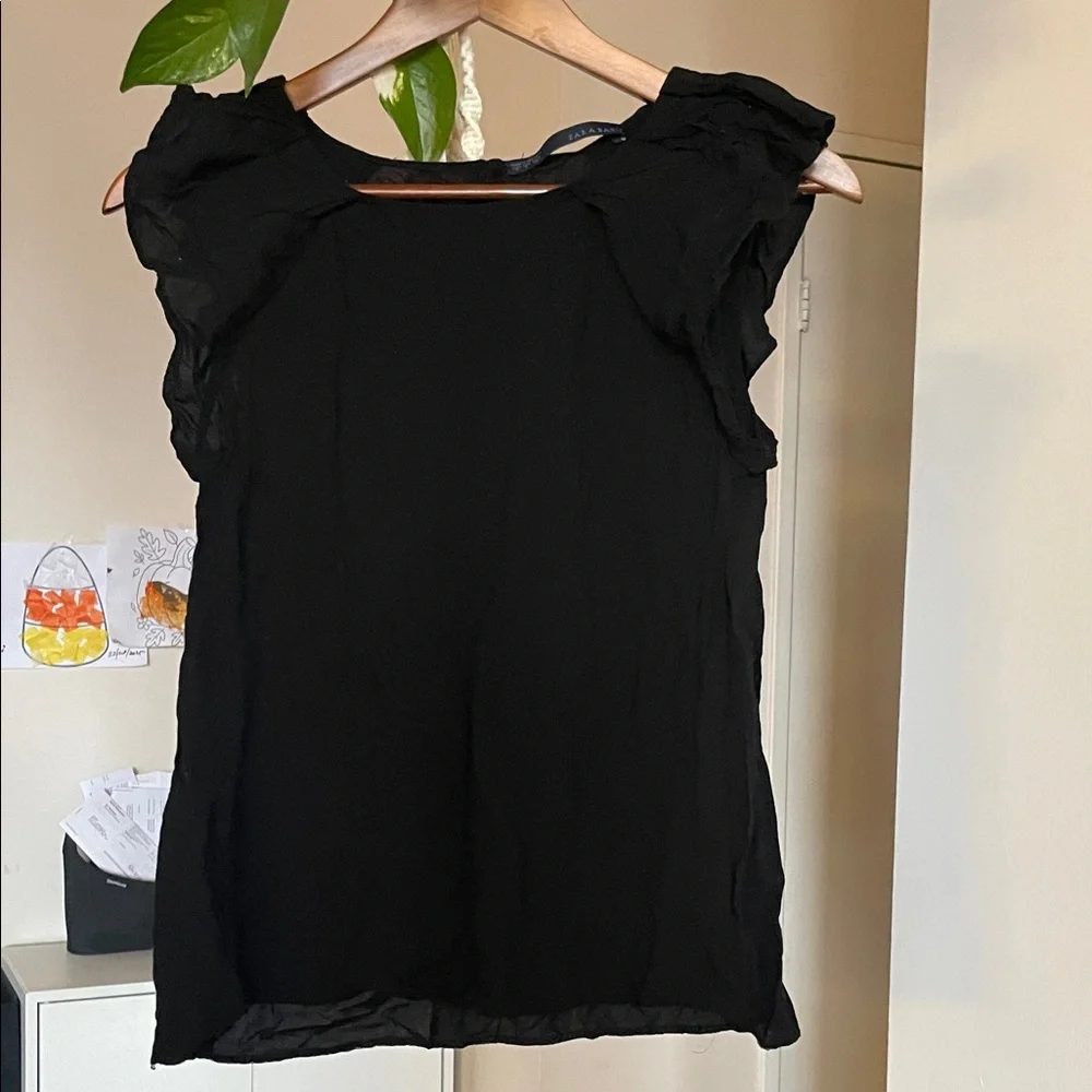 Chic black blouse with ruffled sleeves. Perfect for a stylish look.