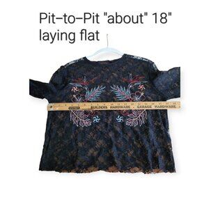 This Zara crop top features a stunning black lace design with intricate bird and leaf embroidery. The semi-sheer fabric and purposefully ragged cuffs and hem enhance its unique style.