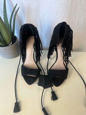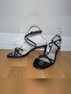 Chic black lace-up heeled sandals from Zara. Square toe with minimalist straps that wrap up and around the ankle with a customizable fit & a 2.5 inch heel for comfort and practicality.